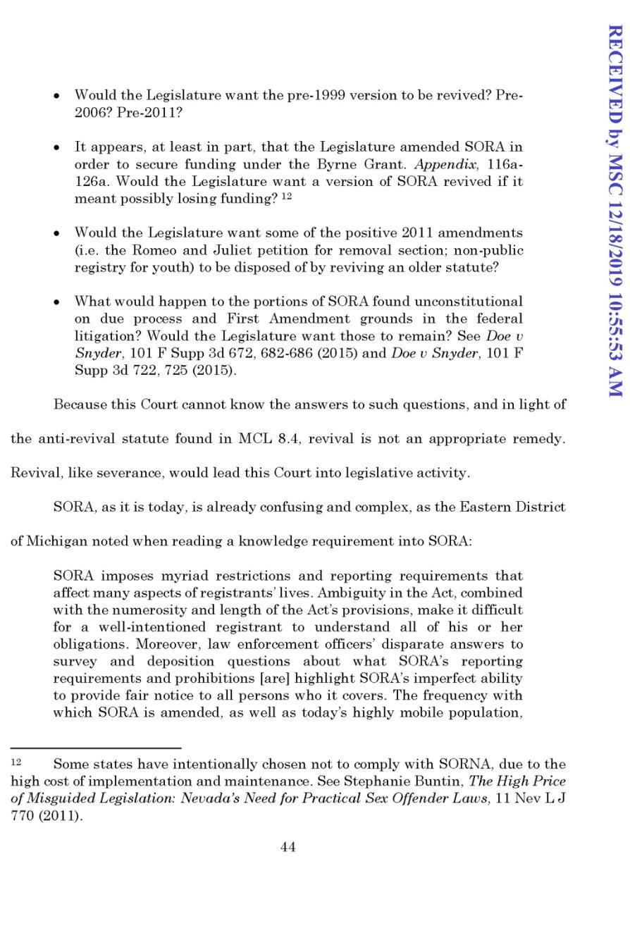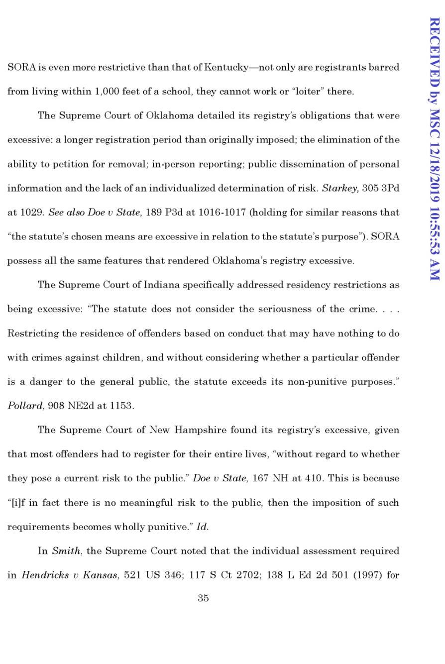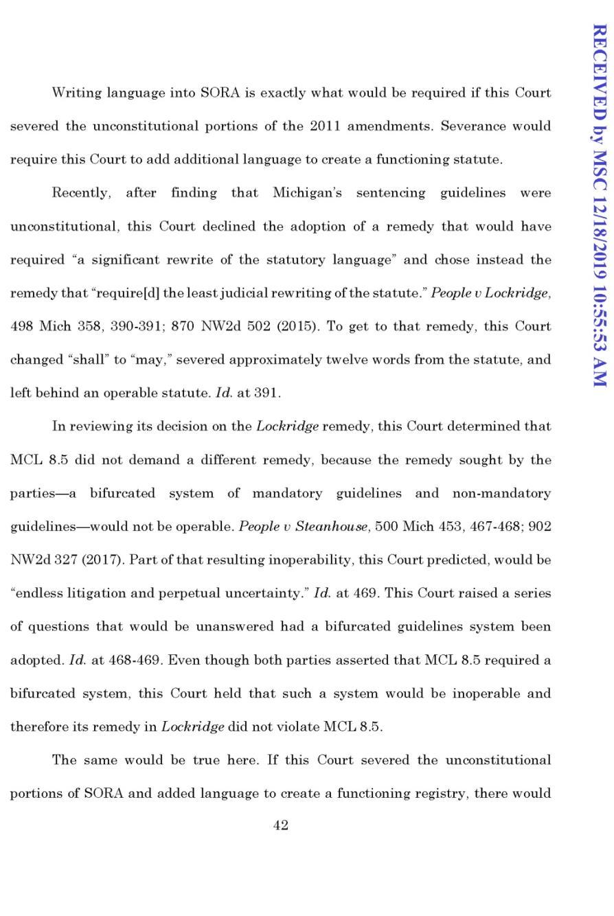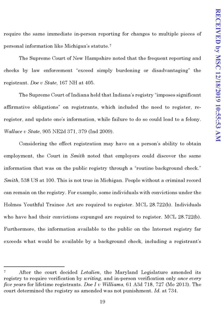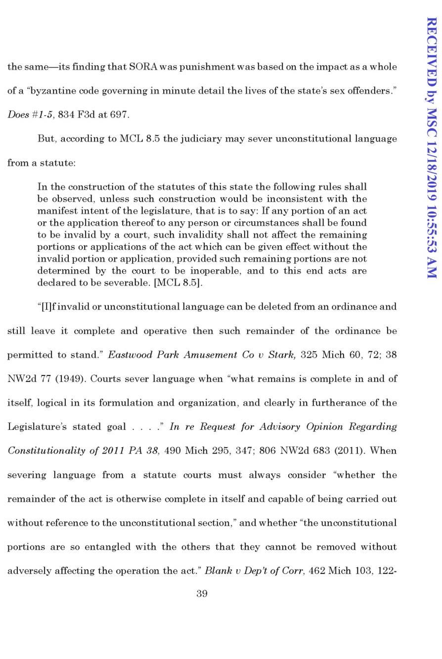 The issue in People v Betts was whether the 2011 Sex Offenders Registration Act was unconstitutional, ex post facto punishment. In July 2021, the Michigan Supreme Court held that it was. The decision capped off nine years of litigation, which first began with Mr. Betts’s pro per motion in the trial court. The Court specifically noted the following portions of the 2011 SORA that supported its conclusion that registration was punishment, and unconstitutional when imposed retroactively: it restricts where registrants can live, work, and loiter; it is comparable to shaming, given the public internet registry and the vast amount of information made public just by registration; it resembles parole, given the “significant amount of supervision by the state”; it imposes onerous burdens such as immediate in person reporting requirements based on numerous and often mundane life events; it is excessive given the “uncertainty of the 2011 SORA’s efficacy” in reducing recidivism, due to the lack of an individualized assessment of risk. All of SORA’s punitive burdens were discussed extensively in this brief.
