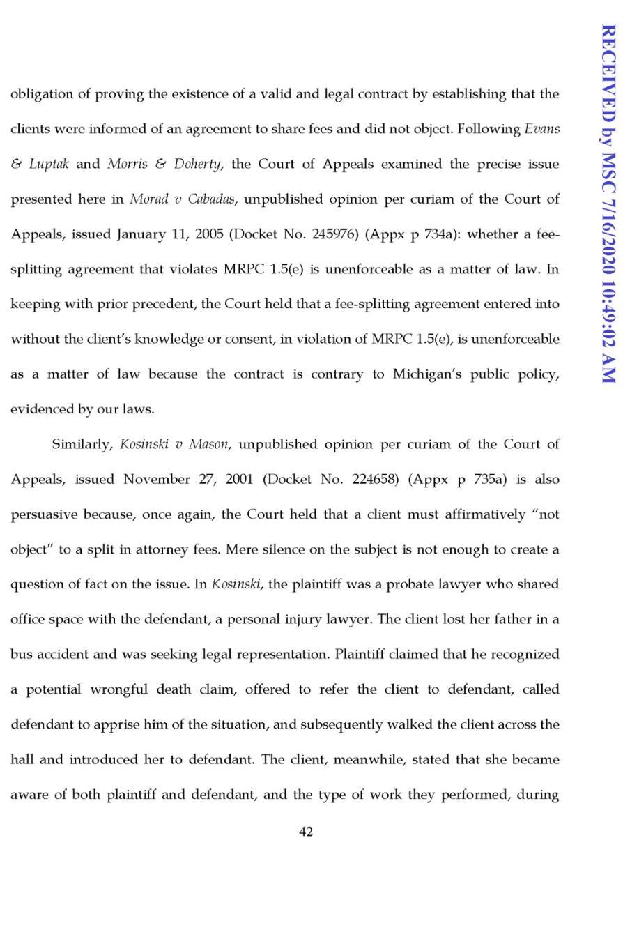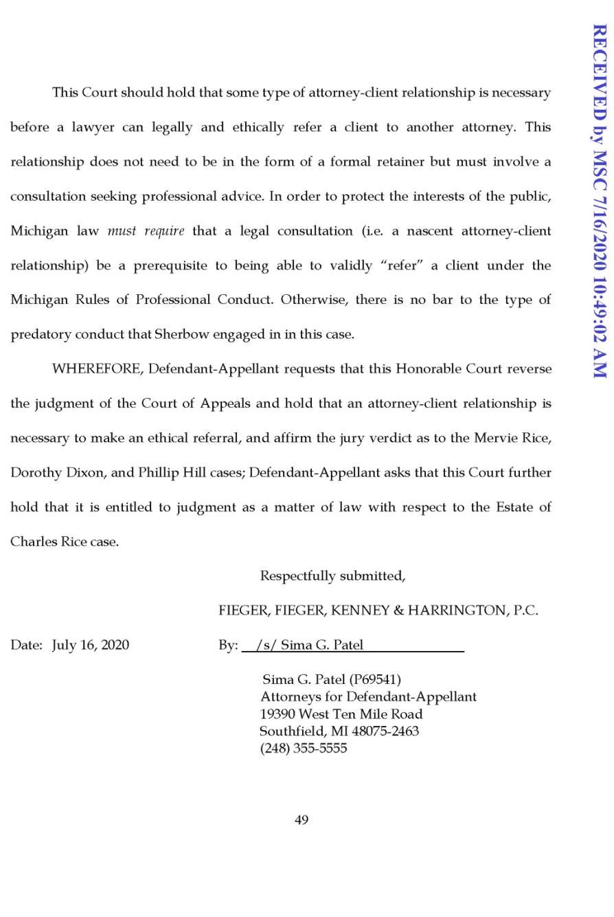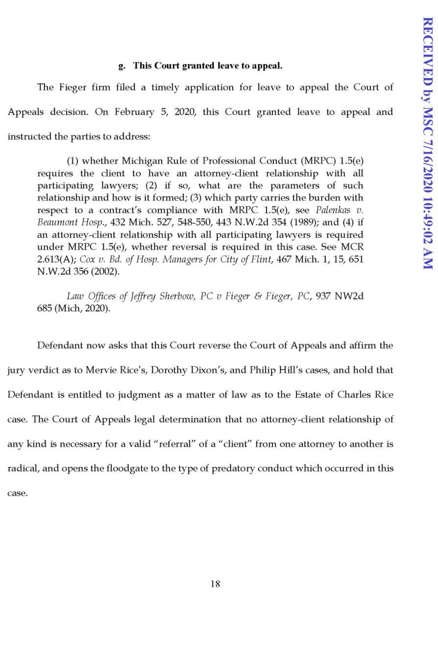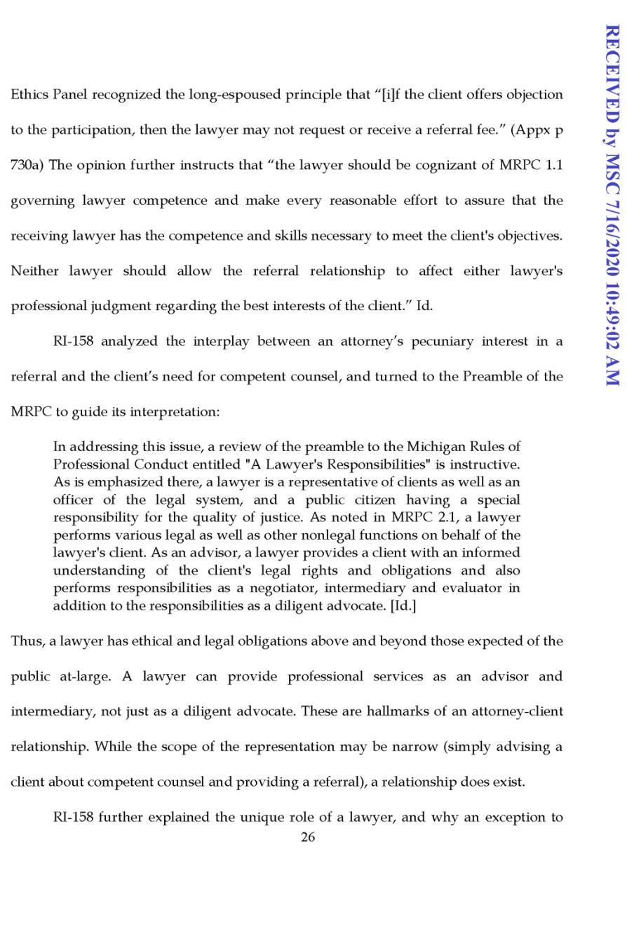 Defendant Appellant’s brief argued that the Michigan Court of Appeals cleared a pathway for predatory practices when it held that an attorney client relationship is not a necessary prerequisite for a lawyer to claim an attorney fee for legally and ethically referring a client under MRPC 1.5(e). Defendant Appellant’s brief also addressed the order for a new trial. Citing a consensus of cases on this matter, Defendant Appellant encouraged the Court to find that there was no basis for the Court of Appeals to order a new trial. The brief pointed out that because an attorney client relationship is required, the trial court did not err in instructing the jury that such a