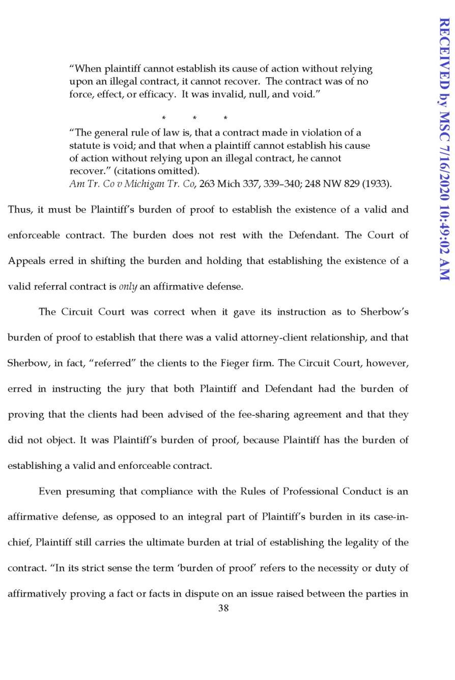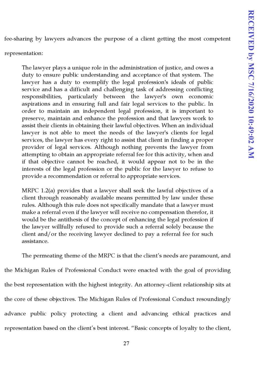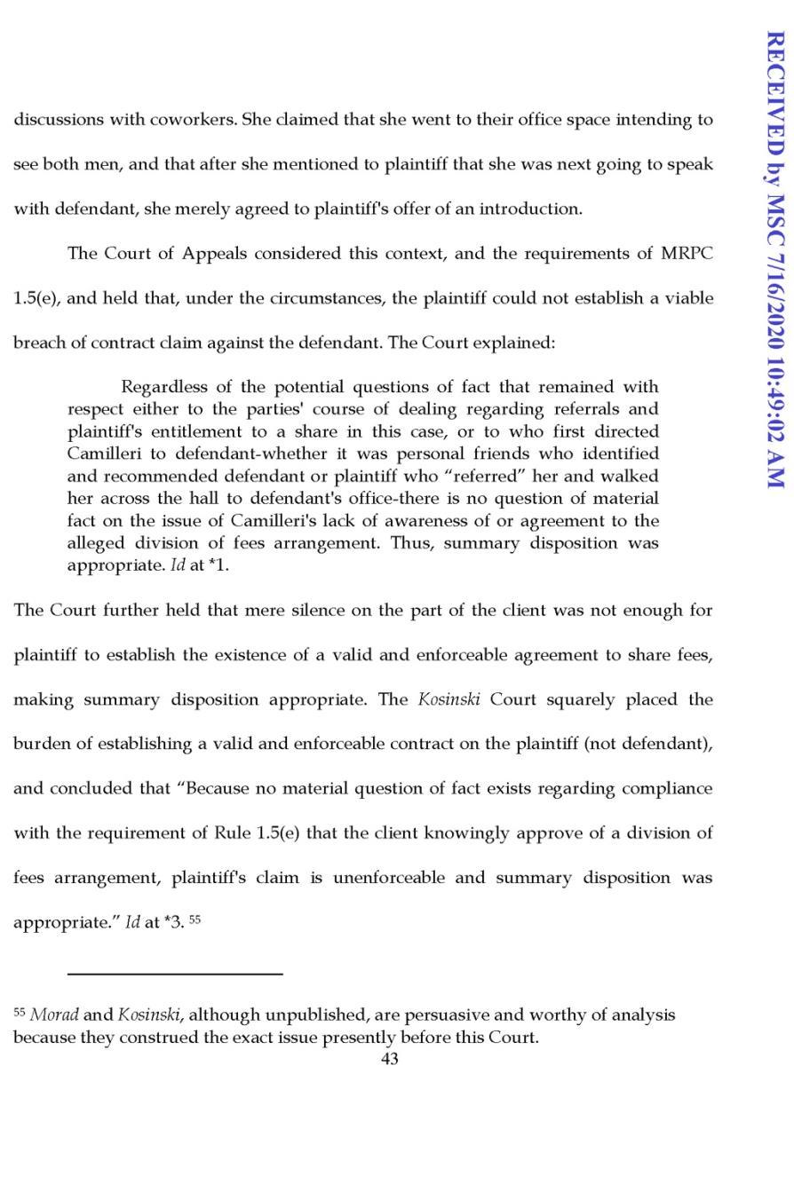 Defendant Appellant’s brief argued that the Michigan Court of Appeals cleared a pathway for predatory practices when it held that an attorney client relationship is not a necessary prerequisite for a lawyer to claim an attorney fee for legally and ethically referring a client under MRPC 1.5(e). Defendant Appellant’s brief also addressed the order for a new trial. Citing a consensus of cases on this matter, Defendant Appellant encouraged the Court to find that there was no basis for the Court of Appeals to order a new trial. The brief pointed out that because an attorney client relationship is required, the trial court did not err in instructing the jury that such a