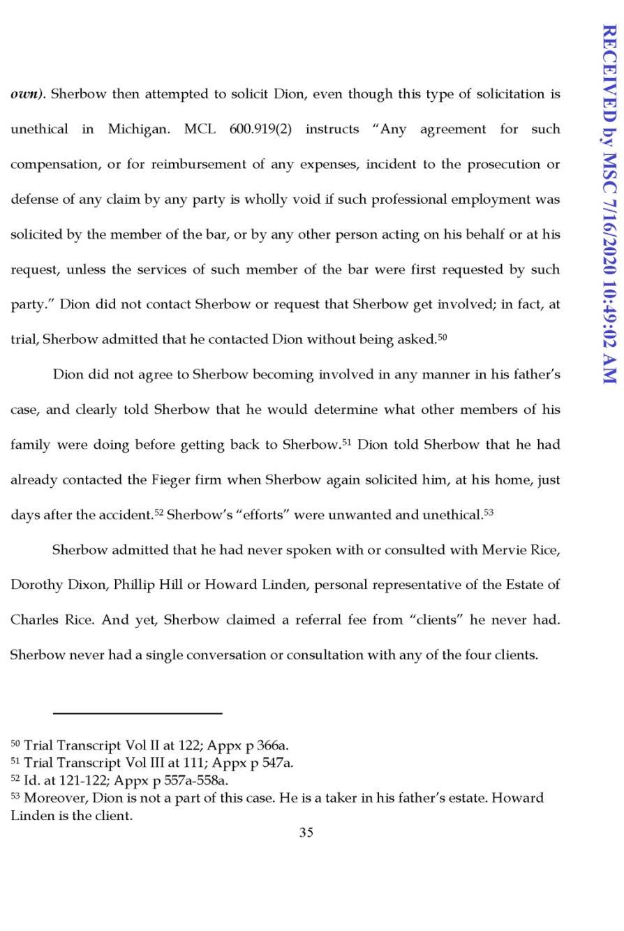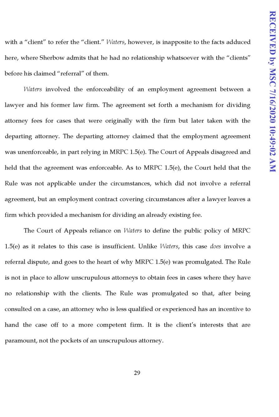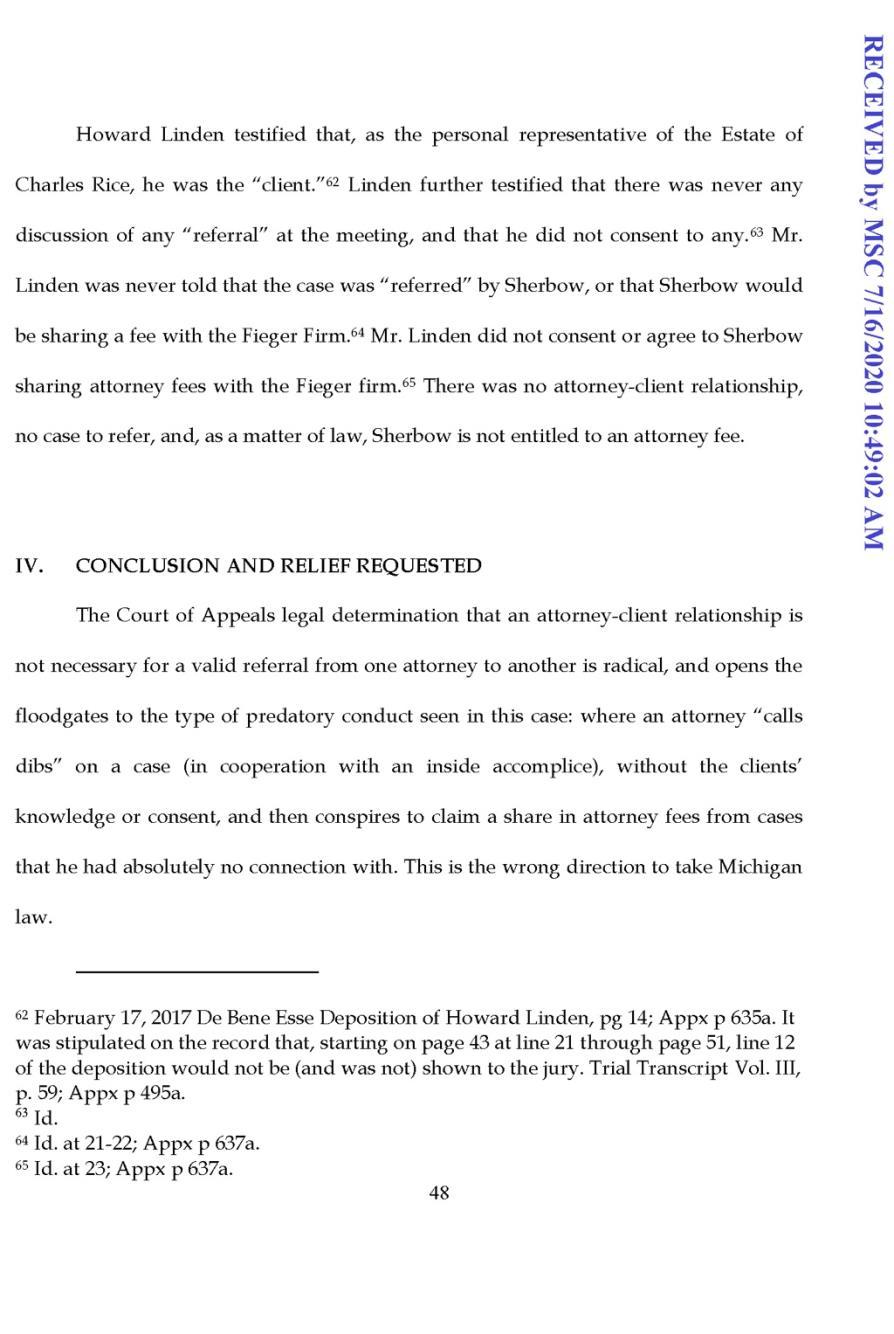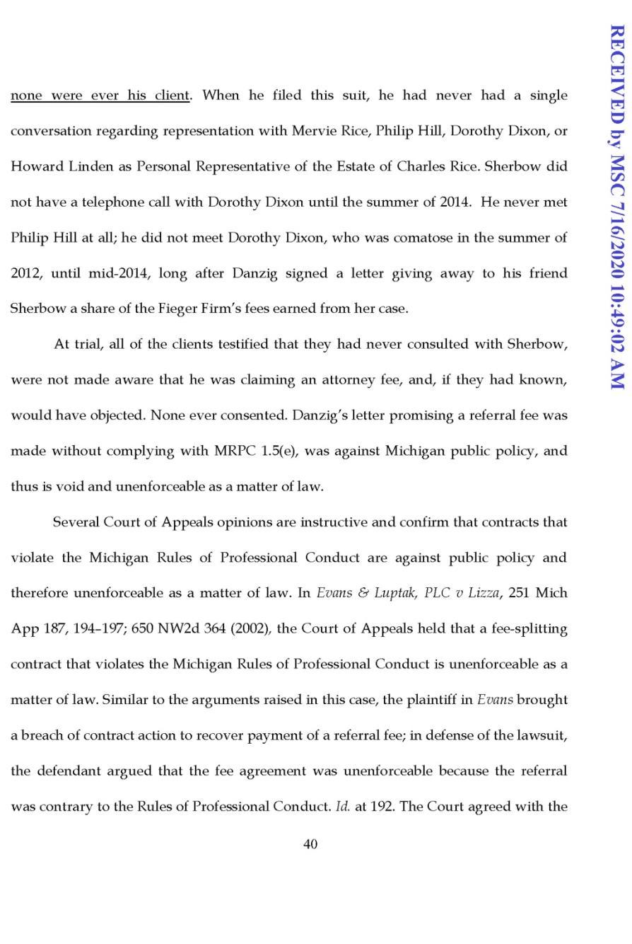 Defendant Appellant’s brief argued that the Michigan Court of Appeals cleared a pathway for predatory practices when it held that an attorney client relationship is not a necessary prerequisite for a lawyer to claim an attorney fee for legally and ethically referring a client under MRPC 1.5(e). Defendant Appellant’s brief also addressed the order for a new trial. Citing a consensus of cases on this matter, Defendant Appellant encouraged the Court to find that there was no basis for the Court of Appeals to order a new trial. The brief pointed out that because an attorney client relationship is required, the trial court did not err in instructing the jury that such a