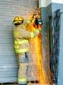 Ù Firefighters are forced to use power saws and other heavy equipment to gain access to doors and windows blocked by storm shutters.