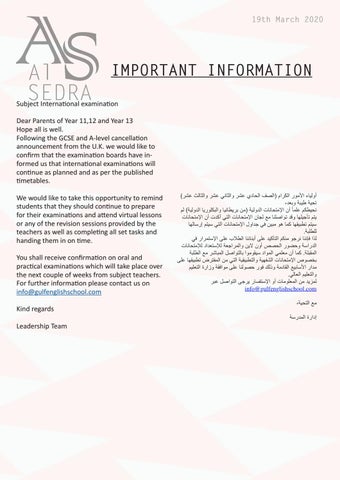 IMPORTANT INFORMATION Subject International examination Dear Parents of Year 11,12 and Year 13 Hope all is well. Following the GCSE and A-level cancellation announcement from the U.K. we would like to confirm that the examination boards have informed us that international examinations will continue as planned and as per the published timetables. We would like to take this opportunity to remind students that they should continue to prepare for their examinations and attend virtual lessons or any of the revision sessions provided by the teachers as well as completing all set tasks and handing them in on time. You shall receive confirmation on oral and practical examinations which will take place over the next couple of weeks from subject teachers. For further information please contact us on info@gulfenglishschool.com Kind regards Leadership Team