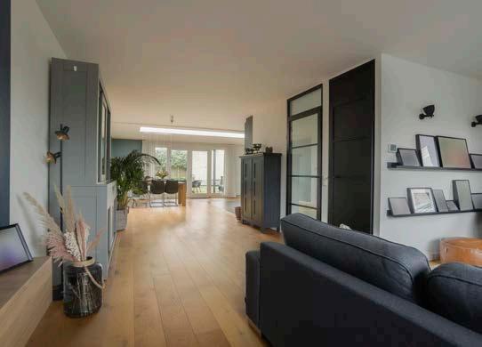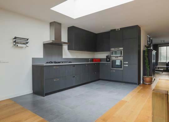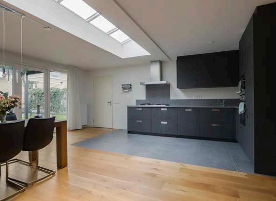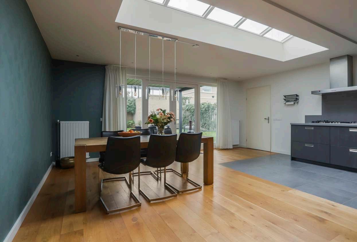 Middels de woonkamer kom je in de eetkamer en de keuken die zich in de uitbouw bevinden. De benedenverdieping heeft zijn ruimte te danken aan de uitbouw die in 2016 is geplaatst, ook hier geniet je van een fijne lichtinval dankzij de lichtkoepels.