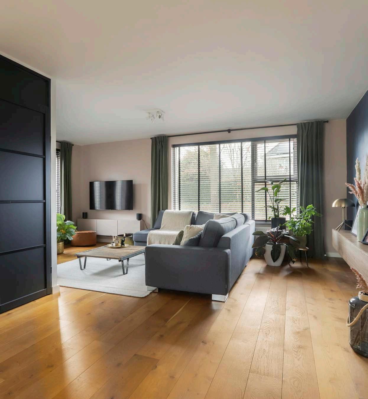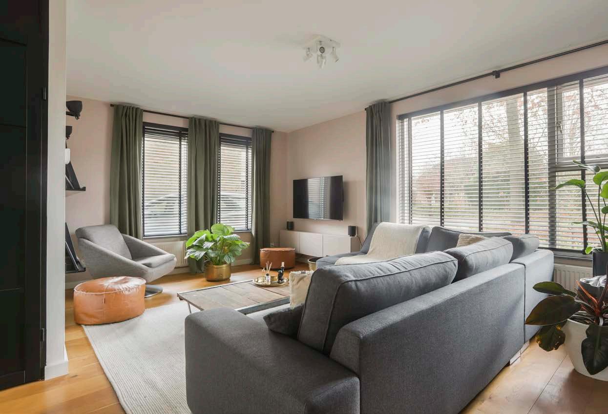 De royale woonkamer is hoogwaardig afgewerkt met een houten vloer en stucwerk op de wanden en biedt een ideale basis om mee op voort te borduren op jouw woonwensen. Ook schijnt het daglicht aangenaam naar binnen dankzij de vele raampartijen wat voor een frisse en lichte uitstraling zorgt. Plaats een comfortabele zithoek en het genieten zal hier vanzelf gaan!