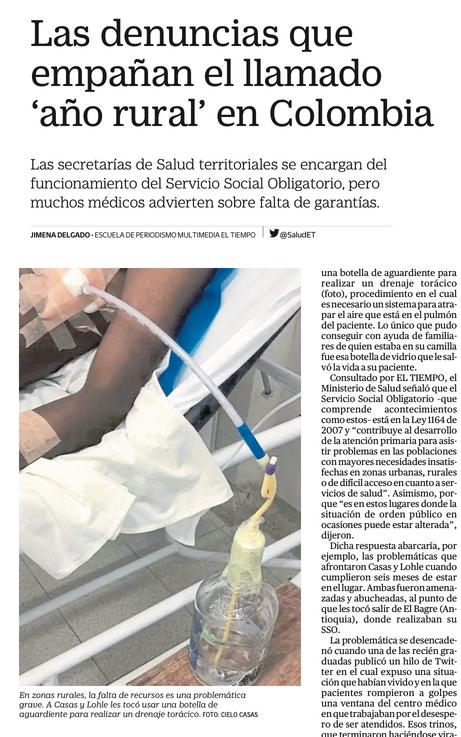 una botella de aguardiente para realizar un drenaje torácico (foto), procedimiento en el cual esnecesariounsistemaparaatrapar el aire que está en el pulmón del paciente Lo único que pudo conseguir con ayuda de familiares de quien estaba en su camilla fueesabotelladevidrioquelesalvó la vida a su paciente Consultado por EL TIEMPO, el Ministerio de Salud señaló que el Servicio Social Obligatorio –que comprende acontecimientos como estos– está en la Ley 1164 de 2007 y contribuye al desarrollo de la atención primaria para asistir problemas en las poblaciones con mayores necesidades insatisfechas en zonas urbanas, rurales o de difícil acceso en cuanto a servicios de salud” Asimismo porque es en estos lugares donde la situación de orden público en ocasiones puede estar alterada”, dijeron Dicha respuesta abarcaría por ejemplo, las problemáticas que afrontaron Casas y Lohle cuando cumplieron seis meses de estar enellugar Ambasfueronamenazadas y abucheadas, al punto de que les tocó salir de El Bagre (Antioquia) donde realizaban su SSO