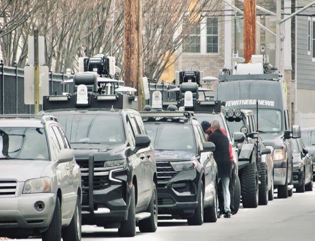 Police caution tape can be seen where the body of 67-year-old Rose Massoni was discovered by Harrison police in the early-morning hours of Tuesday, Jan. 17. Ms. Massoni was pronounced dead at University Hospital, Newark, an hour after police arrived. Left inset, news vans from New York at the scene. At right, a Harrison patrol vehicle was still at the scene hours after police were first sent to Harrison Gardens.