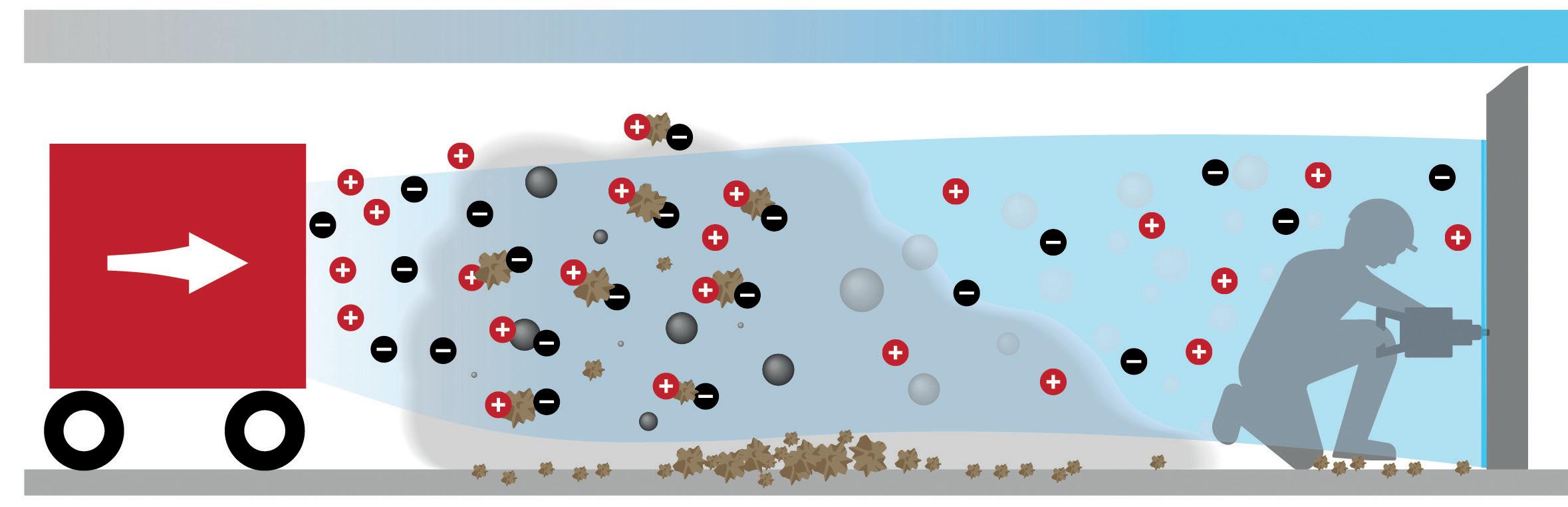 With Jonex, dust settles on the floor and does not swirl up but stays there. In addition, the ionization results in signi ficantly lower noise levels and lower costs through easier handling, lower filter consumption, fewer and simpler clea nings and lower power consumption compared to traditional air cleaners.