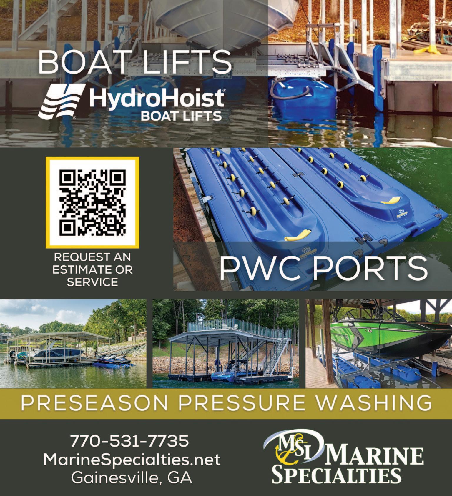 54 LAKESIDE June 2023 • Grading • Hauling • Landscape installation • Lot clearing • Concrete removal • Timber or allan block retaining walls • Pathway clearing & maintenance • Commercial and residential demolition • Mulching (red, brown, cypress) • Fill dirt, topsoil, screened topsoil • Licensed & Insured • References Available 770-475-3252 Free Estimates Grading • Hauling • Landscaping Martin Docks, Inc. Serving Lanier ‘In the Spirit of Excellence’ Since 1956 • Year-Round Maintenance & Repair Service • Dockwatch - Year Long Maintenance Plan • Repairs, Re-decks, Adjustments, Refloats, Additions • Electrical Packages Available • Custom Built Boat DocksAluminum & Steel • Residential, Commercial & Community Docks • Cellofoam & Formex Floats • Ramps, Gangways & Shoreline Steps • Rip Rap • Dredging • Dock Accessories • Used Docks, Consignments & Trade-Ins Welcome • Serving Lanier, Allatoona, Hartwell & Surrounding Lakes Boat Lift, PWC Lift, Custom Lift Designs for Watercraft of All Kinds Sales Office: 1740 Dawsonville Hwy Gainesville, GA 30501 www.martindocks.com 770 536-0189 Fax: 770 536-4444 Dealer for HOMES www.LuxuryLakeLanierHomes.com - Special Spring Offer! 4% total to sell (1.5% to us