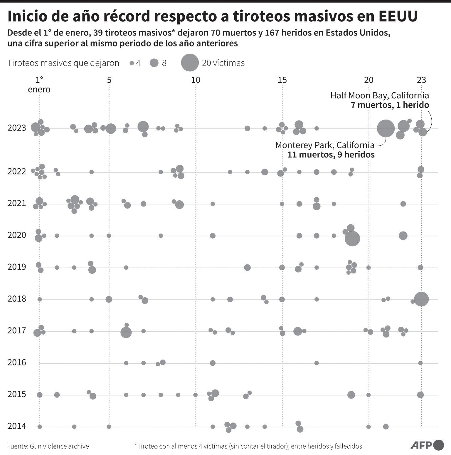 Solo en los 27 días que hasta ahora transcurrieron de 2023 hubo en el país 42 tiroteos masivos (mass shootings).