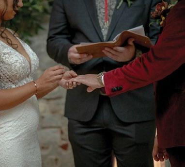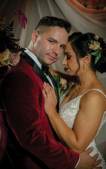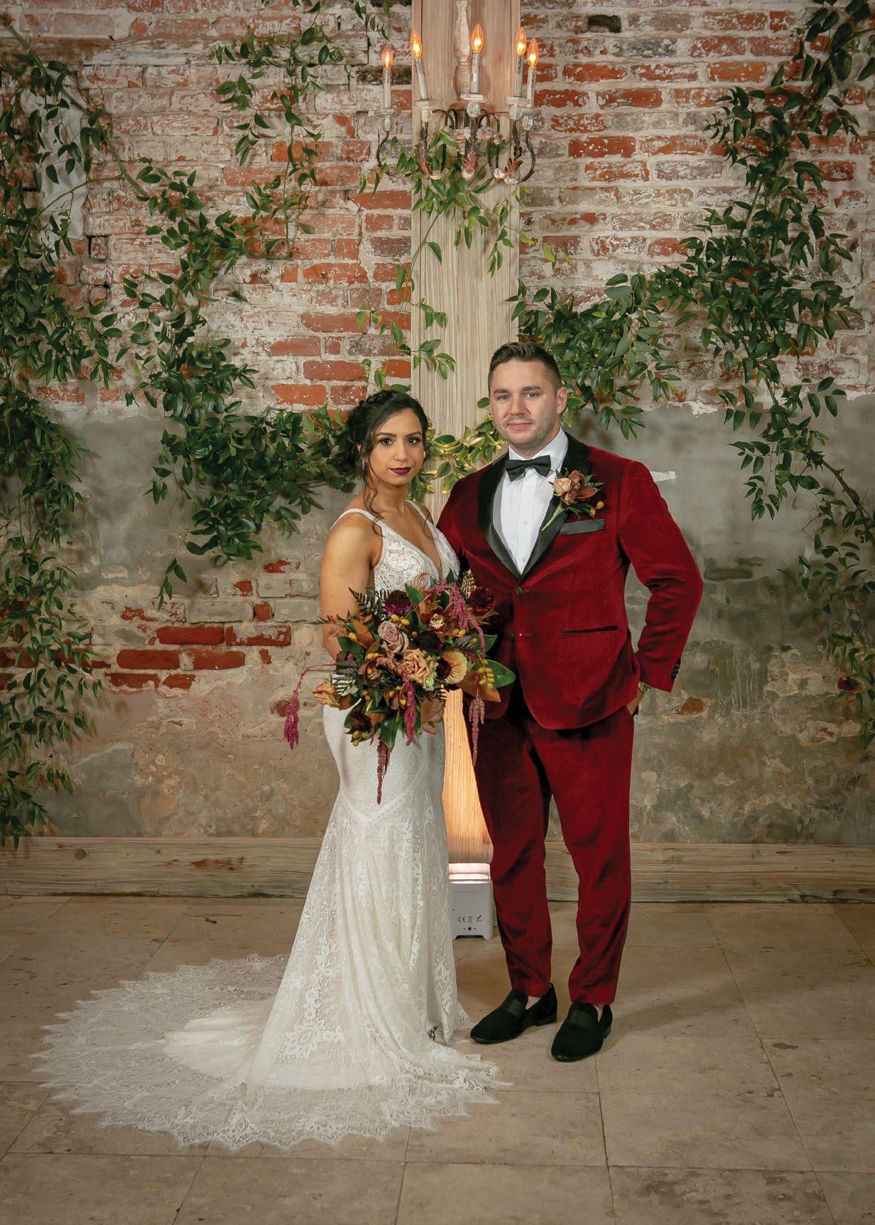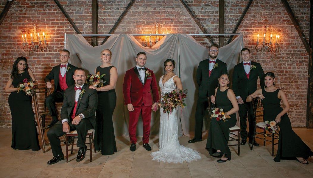 Daniella wore a lace Lillian West gown and Ronald chose a burgundy velvet tuxedo. Their wedding party wore black.