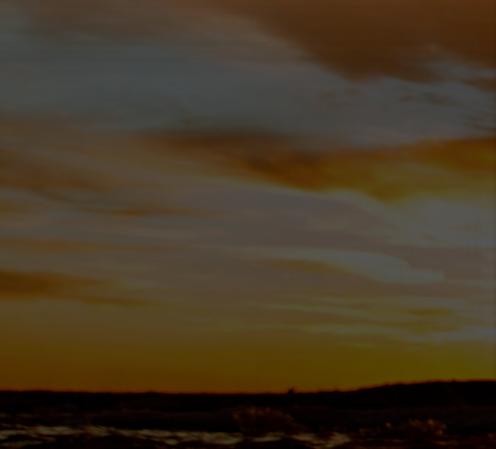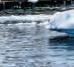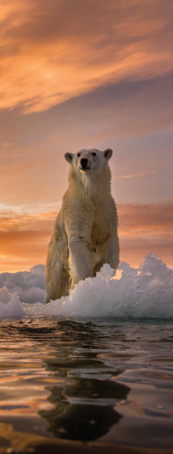 From a patch of ice in the Canadian High Arctic, a polar bear surveys a sea lit up by sunset.