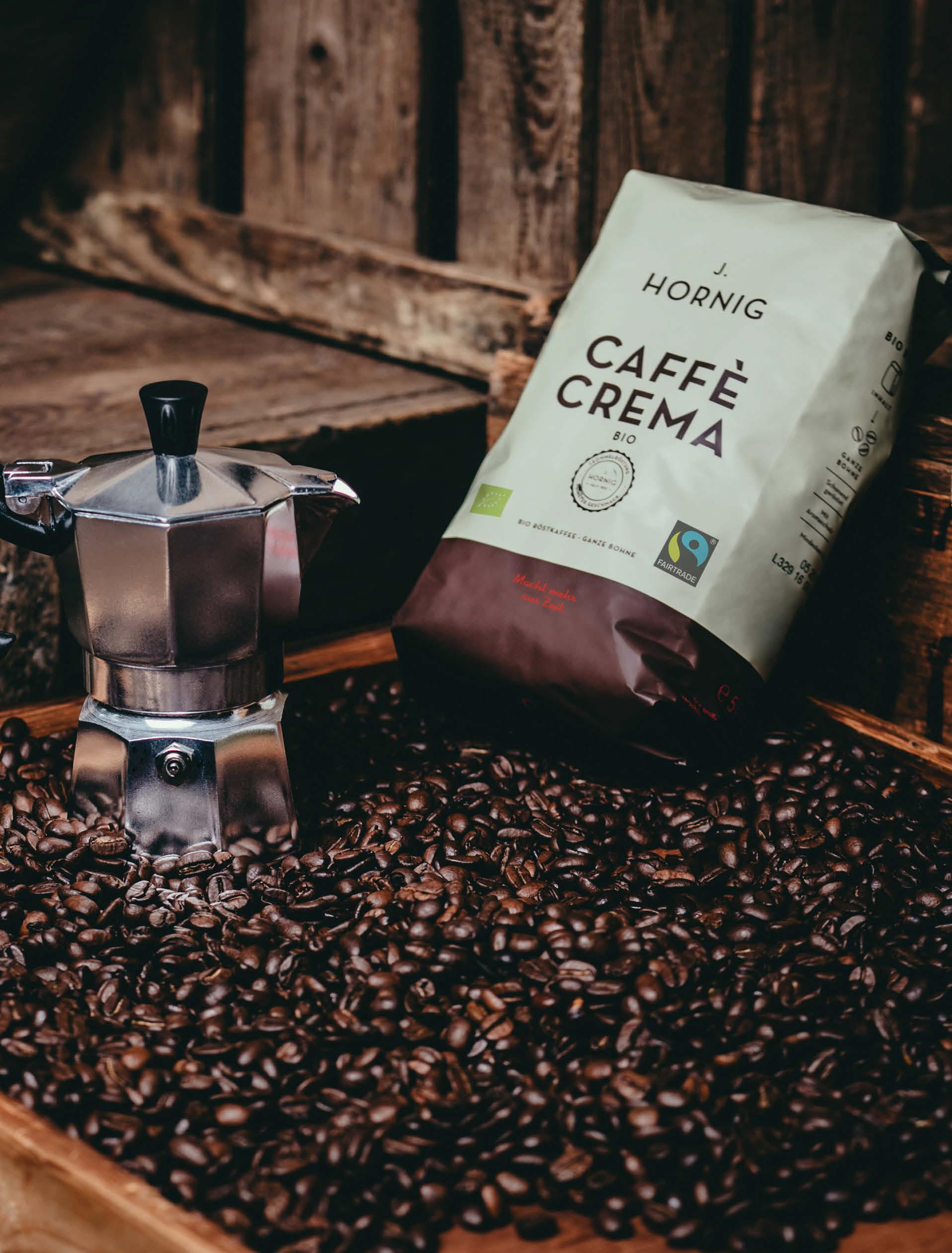 Krä iger Geschmack und perfekte Crema mit unserem Caffè Crema Bio, herangewachsen in den besten Anbaugebieten, gehandelt nach Fairtrade-Regeln.