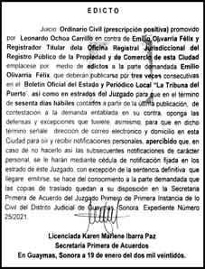 Gilberto Félix Bours Presidente de Consejo Sergio García Vargas Director General sCésar Tovar Longoria Director Editorial • Conmutador: (644) 410-3030 • Publicidad: (644) 410-3000 TRIBUNA DEL YAQUI, publicación de circulación diaria. Año LI. Certificado de Licitud de Título y Contenido: 16469. Reserva de Derechos al Uso Exclusivo: 04-2016-041313515500-101, otorgado por el Instituto Nacional del Derecho del Autor. Publicado y distribuído por TRIBUNA DEL YAQUI S.A. DE C.V., Domicilio de la impresión en Guadalupe Victoria No.115 C.P. 85160 Col. Campestre, Ciudad Obregón, Sonora, Tel. 410 30 30. El contenido de los artículos es responsabilidad exclusiva de los autores. Queda estrictamente prohibida la reproducción total o parcial de los contenidos e imágenes de la publicación sin previa autorización de GILBERTO FELIX BOURS. Miembro de la Sociedad Interamericana de Prensa.