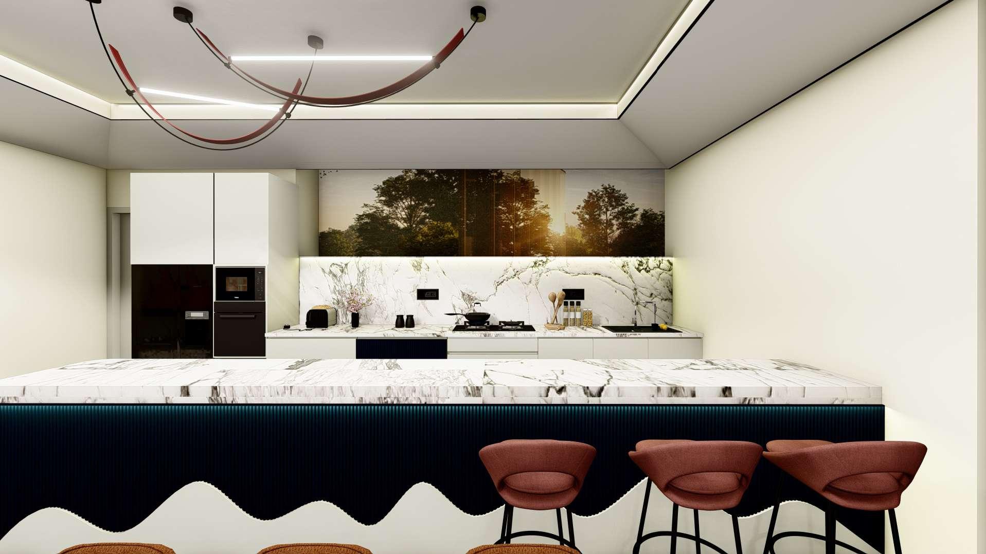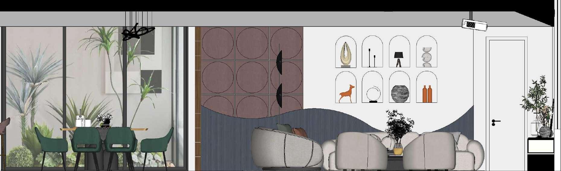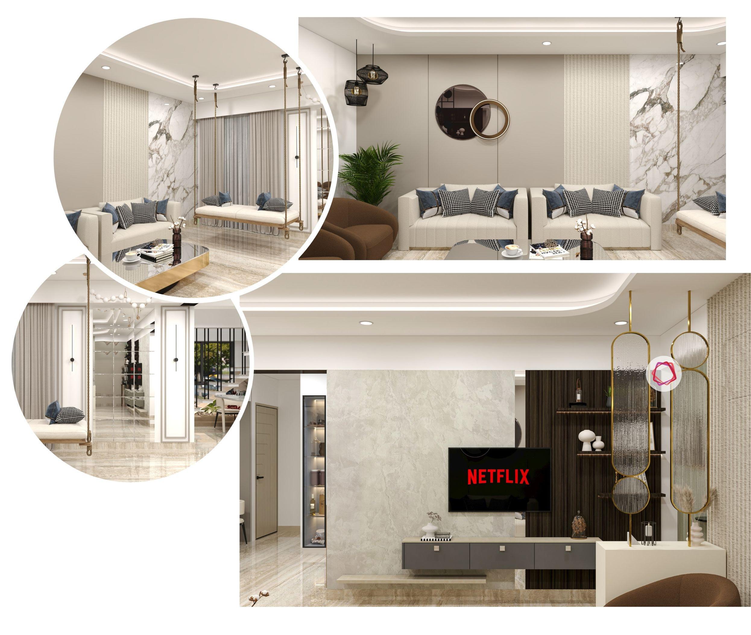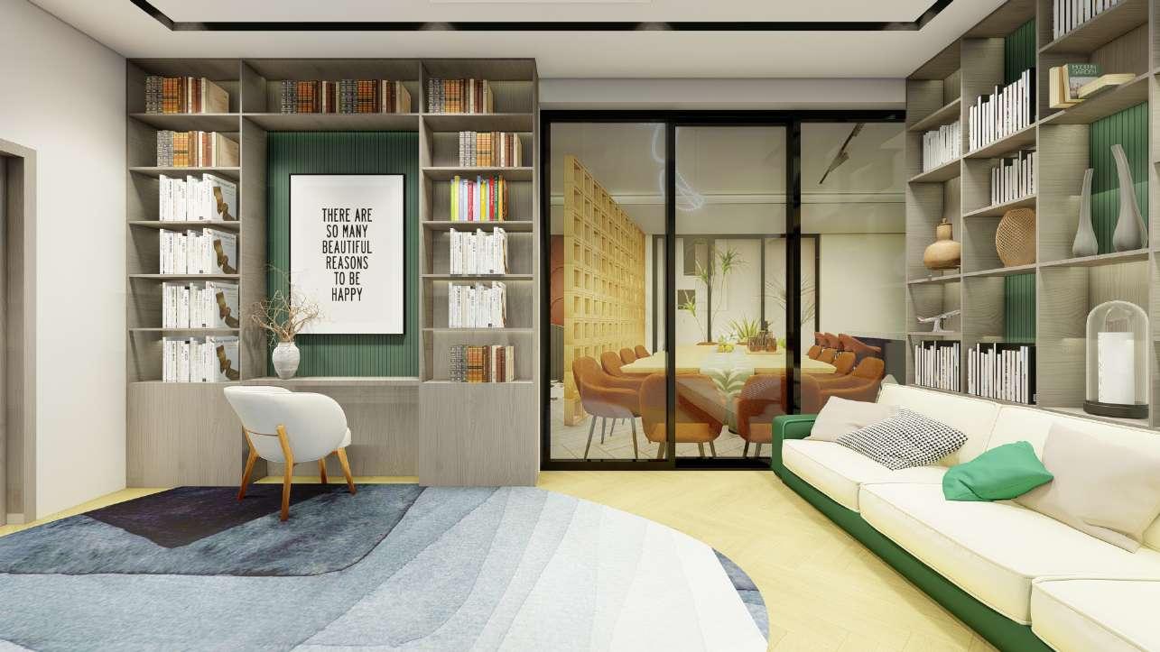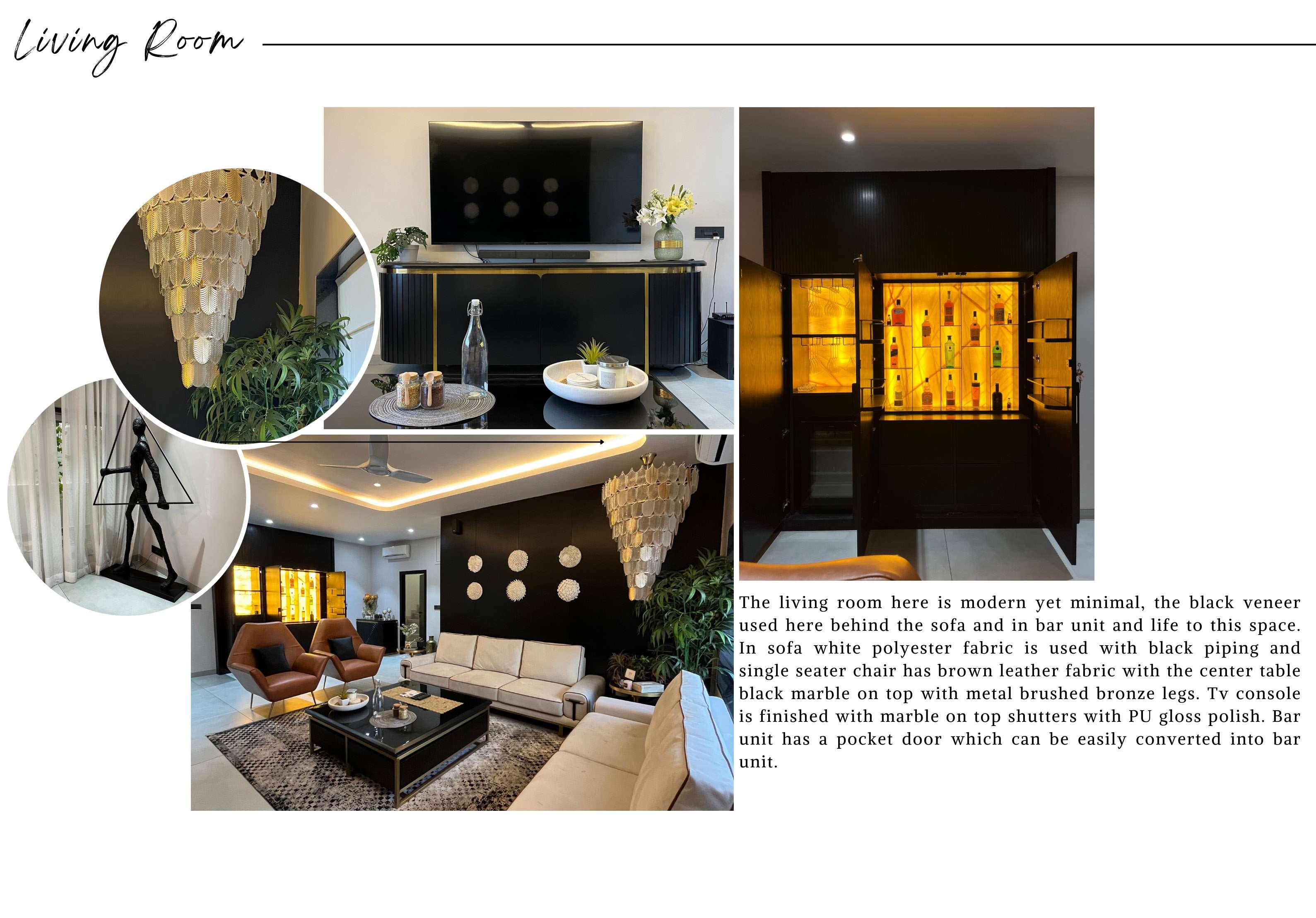 Living, dining and kitchen are interconnected with each other. The space is designed very modern and minimal, wall panels at the back of the sofa brings a subtle textures into the whole space, highlighted with free standing lamp.