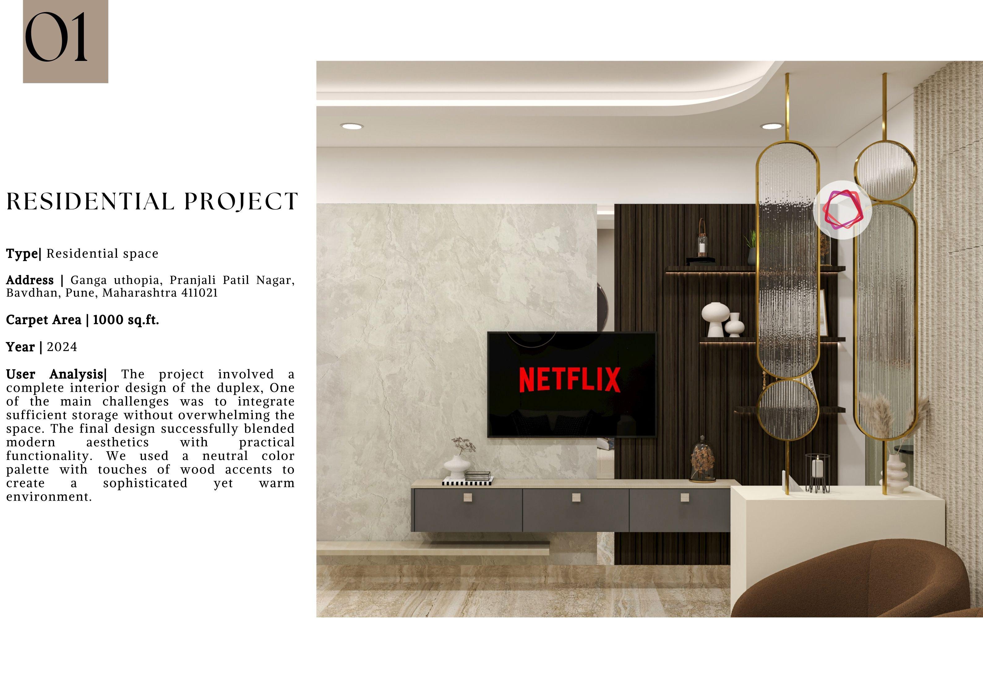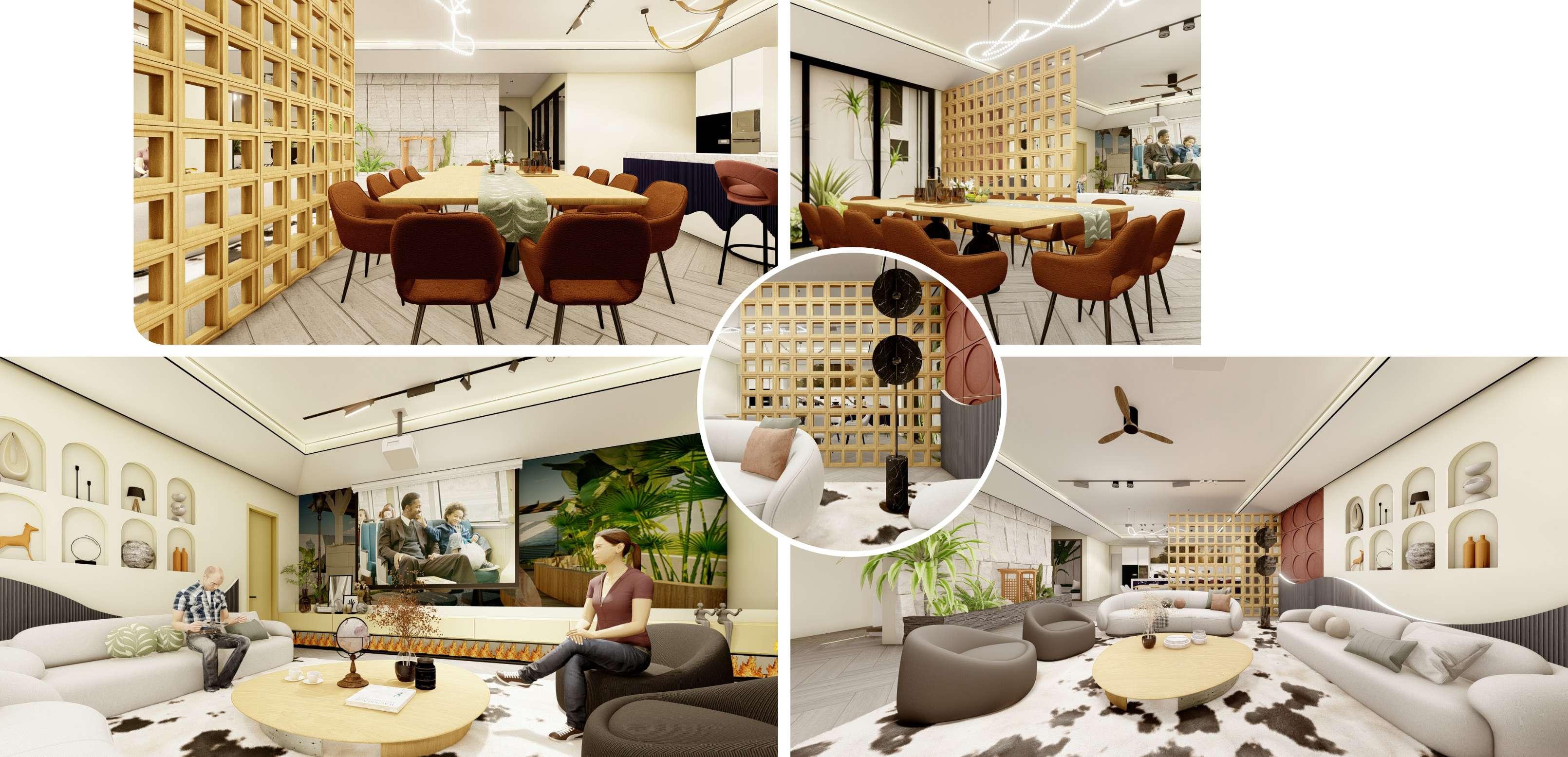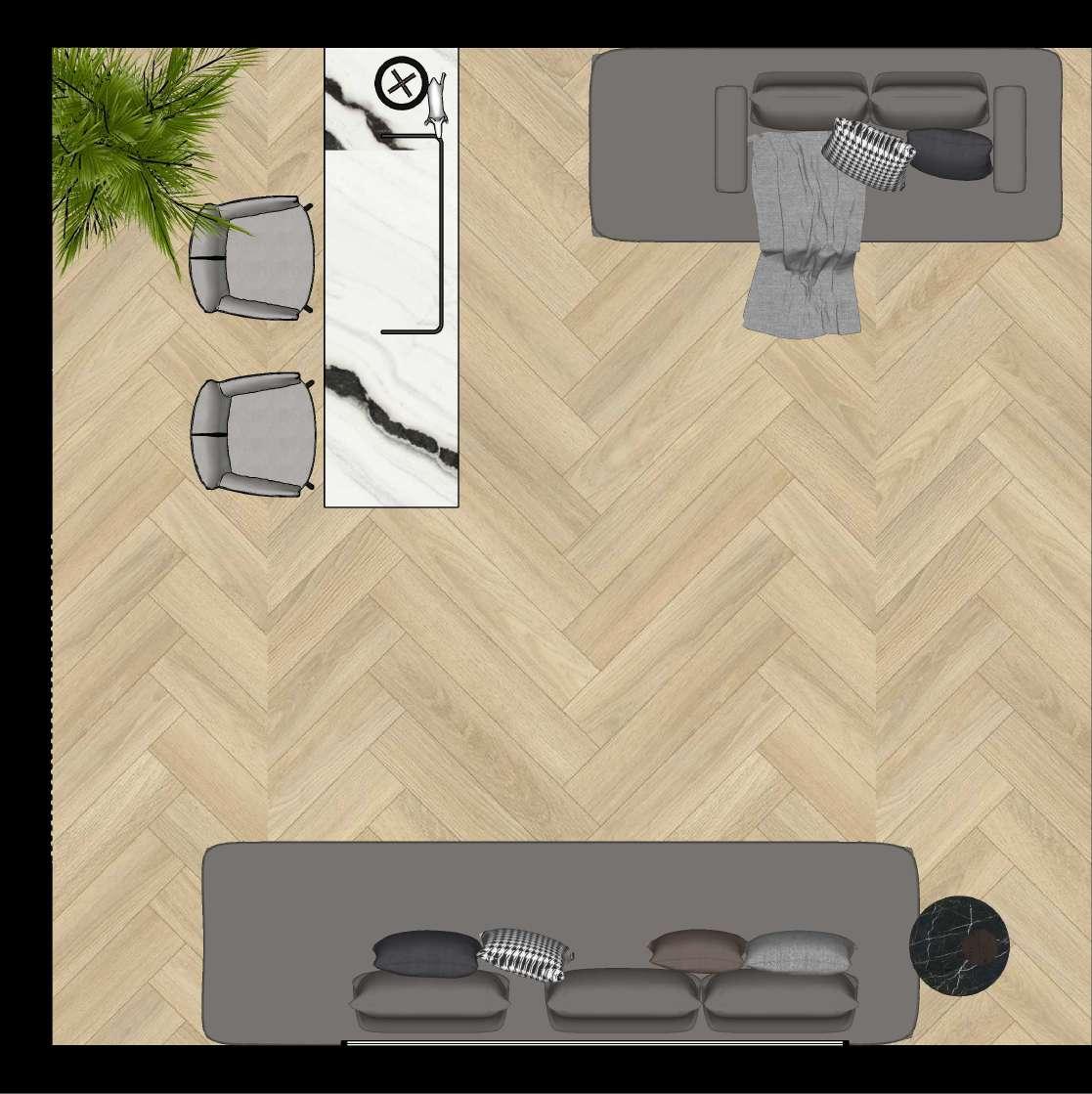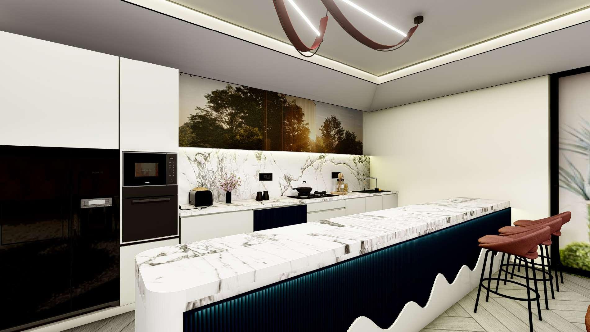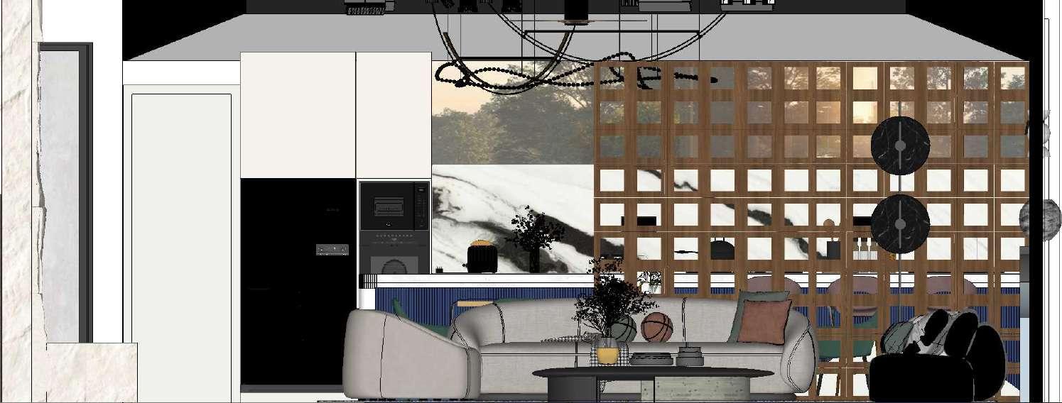 Living, dining and kitchen are interconnected with each other. The space is designed very modern and minimal, wall panels at the back of the sofa brings a subtle textures into the whole space, highlighted with free standing lamp.