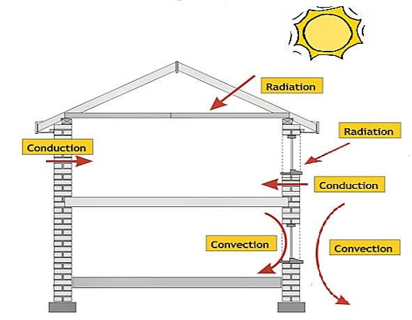 Nhiệtbịmấthoặcthuđượcdotruyềnquatrần,tường,sàn,cửasổvà cửaravàoNgườitathấyrằngkhoảng60%nhiệtthấtthoáttrựctiếpquatrần vàtườngcủatòanhàvàkhoảng15%xuyênquakínhvàkhoảng25%lượng nhiệtxâmnhậpquacáckhenứt,khehởvàcửaravào10