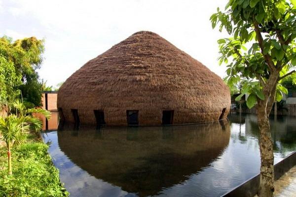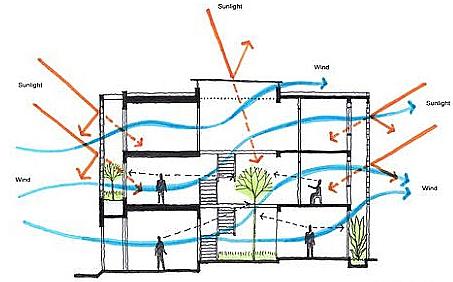 Côngtrìnhsửdụngnănglượnggiótựnhiênvàhơinướctừhồnhântạo đểthônggióvàlàmmátchotoànngôinhà.Trênđỉnhmáinhàcómột khoảngmở1,5mđểthônggióvàlấysangbanngày.