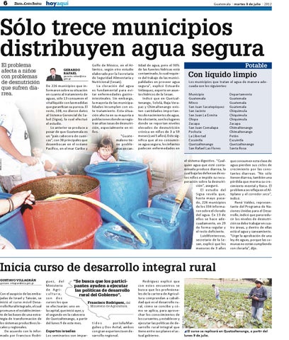Departamento Guatemala Guatemala Guatemala Chiquimula Chiquimula Chiquimula Zacapa Chimaltenango Chimaltenango Petén Escuintla Quetzaltenango Santa Rosa que consumen esta clase de agua pierden sus ciclos de crecimiento por las constantes diarreas. “No sólo tienen diarrea, también una pérdida que merma su crecimiento mental y físico. El problema se refleja en el Altiplano y el corredor seco”, indicó. René Valdez, representante del Programa de Naciones Unidas para el Desarrollo, indicó que para reducir los niveles de desnutrición se debe trabajar en cuatro áreas, y dentro de ellas está el agua y saneamiento. “Urge la aprobación de una ley de aguas, porque las comunas no están cumpliendo con clorarla”, dijo.