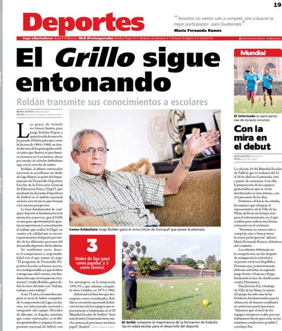 as ganas de triunfo no tienen límites para Jorge Roldán Popol, a quien la vida de nuevo le ha pasado el balón para que como lo hiciera de 1964 a 1968, en donde fue uno de los principales artífices para que Aurora se proclamara monarca en 3 ocasiones, ahora por medio de nóveles futbolistas siga con la cosecha de éxitos. Roldán, el último entrenador nacional en acreditarse un título de Liga Mayor, es parte del departamento de Desarrollo Deportivo Escolar de la Dirección General de Educación Física (Digef), que mediante las Escuelas Deportivas de Futbol en el ámbito nacional asesora a los técnicos que forman a los nuevos prospectos. La base fundamental de cualquier deporte se fundamenta en la iniciación, es por eso, que el Grillo ve una gran oportunidad de aportar su experiencia y conocimiento al trabajo que realiza la Digef, en cuanto a la calidad que se necesita para mejorar el deporte, por medio de los diferentes procesos del desarrollo deportivo de los atletas. Su semblante serio, denota el compromiso y responsabilidad con el que asume el cargo. “El programa de Desarrollo Deportivo Escolar es bueno, necesario e indispensable, ya que el atleta a temprana edad cuenta con fundamentos que sirven para su crecimiento” resaltó Roldán, quien define la clave del éxito con “trabajo, trabajo y más trabajo”. A sus 74 años, el exmediocampista se jacta de haber conquistado 3 campeonatos de Liga con Aurora, ser seleccionado nacional e integrante del equipo Hércules de Alicante, en España, mientras que como entrenador, es el último guatemalteco en ganar el campeonato nacional de futbol, con