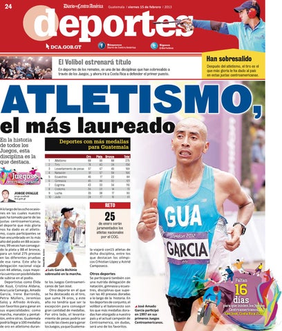 A lo largo de las ocho ocasiones en las cuales nuestro país ha tomado parte de las justas centroamericanas, Faltan el deporte que más gloria nos ha dado es el atletismo, cuyos participantes se han encumbrado en lo más alto del podio en 88 ocasiones;inicien 99 veces conseguique loshan Juegos do la plata y 88 el entroamericanos, bronce, paraCosta un total preseas José, Rica275 2013 en las diferentes pruebas de esa rama. Este año la delegación nacional viaja con 44 atletas, cuya mayoría cuenta con posibilidades de subirse en el podio. Deportistas como Élida de Xuyá, Cristina Aldana, Ana Lucía Camargo, Amado García, Irene Barrondo, Petra Müllers, Jeremías Saloj y Alfredo Arévalo, son favoritos para ganar en sus especialidades: como marcha, maratón y pentatlón, entre otras. Guatemala podría llegar a 100 medallas de oro en atletismo duran-