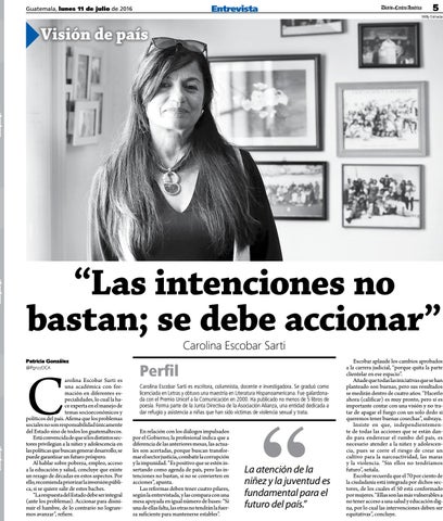 Perfil Carolina Escobar Sarti es escritora, columnista, docente e investigadora. Se graduó como licenciada en Letras y obtuvo una maestría en Literatura Hispanoamericana. Fue galardonada con el Premio Unicef a la Comunicación en 2000. Ha publicado no menos de 5 libros de poesía. Forma parte de la Junta Directiva de la Asociación Alianza, una entidad dedicada a dar refugio y asistencia a niñas que han sido víctimas de violencia sexual y trata.