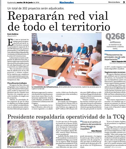n 1 mes se iniciarán los trabajos para la recuperación de la red vial en todo el territorio nacional, lo cual incluirá la reparación de 4 mil 500 kilómetros de carreteras pavimentadas y 2 mil 500 de terracería, informó María Alejandra Má, viceministra de Infraestructura, de la cartera de Comunicaciones. La funcionaria se reunió con diputados de diferentes bancadas, a quienes explicó que se priorizará la atención de los principales tramos de cada departamento, en lo cual se invertirán unos Q268 millones. “Nos encontramos en la fase final de adjudicación de los 302 proyectos, y estamos evaluando las empresas que cumplieron con los requerimientos, pues tenemos la instrucción de privilegiar la transparencia”, dijo.