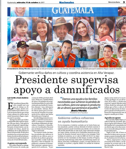 l mandatario Jimmy Morales cumplió ayer una gira de trabajo en Alta Verapaz, donde comprobó el daño en los cultivos a causa de las fuertes lluvias que azotan el país, además de verificar que la ayuda humanitaria llegue a quienes más lo necesitan. “Siempre he dicho que el dinero del pueblo debe regresar al pueblo. Hay que darle a cada quien lo que le corresponde”, expresó el gobernante al entrevistarse con autoridades de Chisec, donde los pobladores de la aldea Playitas le dieron la bienvenida. El Ejecutivo monitorea las acciones para hacer frente a los efectos de las inclemencias del invierno, que ha dejado no menos de 18 mil 500 afectados.