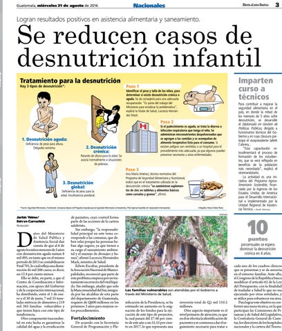 atos del Ministerio de Salud Pública y Asistencia Social dan cuenta de que al 6 de agosto los niños menores de 5 años con desnutrición aguda suman 8 mil 495, en tanto que en el mismo período de 2015 se contabilizaron 9 mil 701, lo cual refleja una disminución de mil 206 casos; es decir, un 12.4 por ciento menos. Ello se debe, en parte, a que el Centro de Coordinación e Información, con apoyo del Gobierno y de la cooperación internacional, ha distribuido, entre el 1 de enero y el 30 de junio, 7 mil 35 toneladas métricas de alimentos a 219 mil 385 familias vulnerables y que tienen hijos con este tipo de insuficiencia. Otro componente trascendental en esta lucha es garantizar la calidad del agua y la erradicación