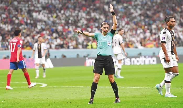 La primera mujer en arbitrar una final de la Copa de Francia, en el pasado curso, también fue pio nera en pitar un choque de la Li gue 1 que la llevó a formar parte del elenco de las designaciones de la UEFA. Dirigió la final de la Su percopa de hace dos años y se con virtió en habitual en partidos de la Liga de Campeones. El choque en tre Costa Rica y Alemania ha sido el primer paso en un Mundial, en Catar 2022, donde esperan su mo mento la ruandesa Salima Mukan sanga y la japonesa Yamashita Yoshimi. Los octavos esperan.