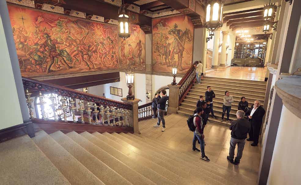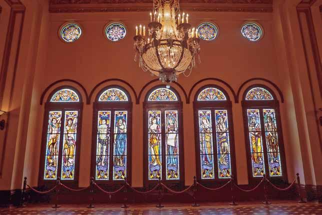 rica del país. Entre los lugares favoritos de los visitantes se encuentra el Salón Banderas, conocido por su ornamentación y por albergar el kilómetro cero del país. Ahí también se ubican majestuosos vitrales y la lámpara en cascada, cuyo peso se calcula en 2.5 toneladas.
