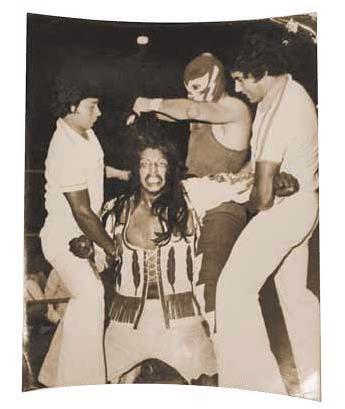 se presentaba con mallas negras—, lo acompañaron en el cuadrilátero durante las tres jornadas su secretario, Joe Galera, y su eterna enamorada, la Viudita Misteriosa