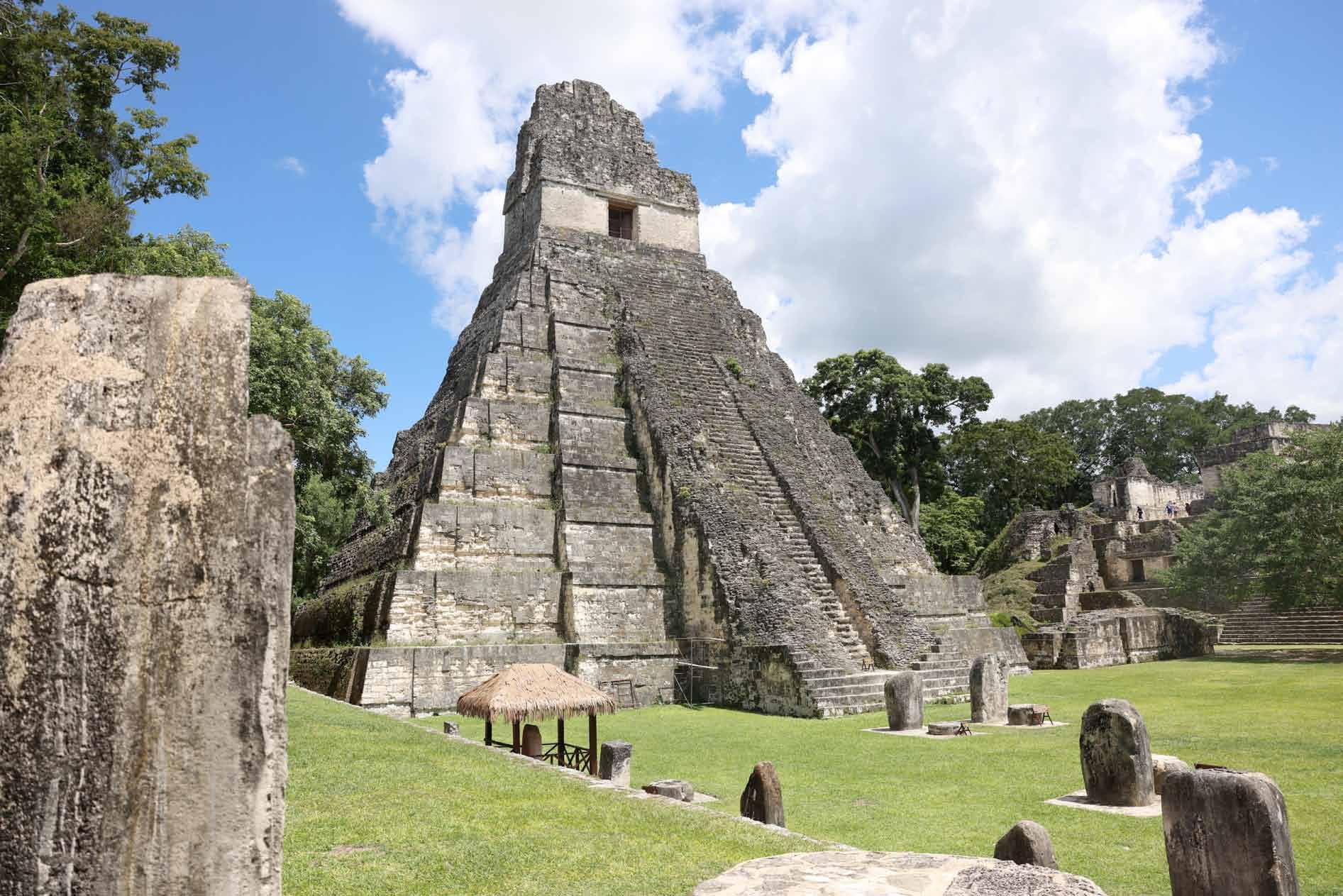 Unos zorros grises corren hacia el monte al ver presencia humana, un mono araña se mece en lo alto de una rama, un pavo ocelado o petenero se pavonea en un claro del bosque y el sonido de las cigarras rompe el silencio durante el trayecto a la Gran Plaza donde se yergue el Templo del Gran Jaguar, ícono mundial de la civilización maya.