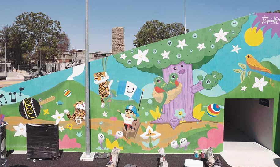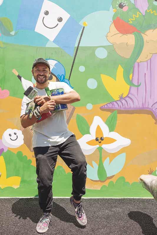 Recuerda que, al inicio del proyecto, solo tenía un gran muro gris, el cual agarró como lienzo para plasmar su inspiración. Con la única instrucción de que debía ser un trabajo para niños, empezó a pintar el boceto de la pieza. Su idea principal fue darle honor a los símbolos patrios y elementos que reconocen a Guatemala, con el peso e importancia de su riqueza cultural. La pieza central parte de una ceiba, en la cual existen dos quetzales pichones, a