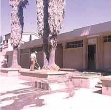 Su fachada tiene tres volúmenes, cuenta con jardineras que se apoyan en la pared y su puerta principal es doble.