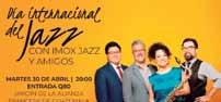 Ascenso al volcán de Pacaya, con la agencia de viaje Sin Límites. Salida desde el centro comercial Tikal Futura, a las 8:00. Valor: 189 quetzales. Para inscribirse al evento deben hacerlo al WhatsApp: 5804-0205. Como parte de la celebración del Día Internacional del Jazz, la reconocida banda guatemalteca Imox Jazz se presentará en la Alianza Francesa Guatemala, 5ª. calle 10-55, zona 13, finca La Aurora, a partir de las 20:00. Valor: 80 quetzales por persona.