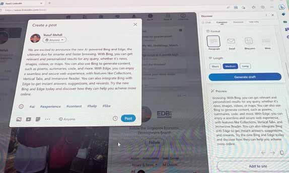 Fotografía de una proyección en pantalla de una publicación en redes sociales generada por inteligencia artificial, que se presentó en la sede de Microsoft en Redmond, Washington (EE. UU).