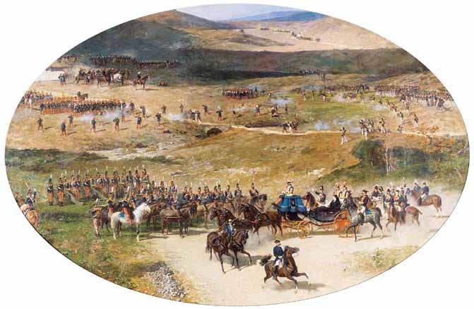La reina regente María Cristina, junto a su hija la infanta Isabel - futura reina Isabel II- pasando revista a las tropas. Por Mariano Fortuny.