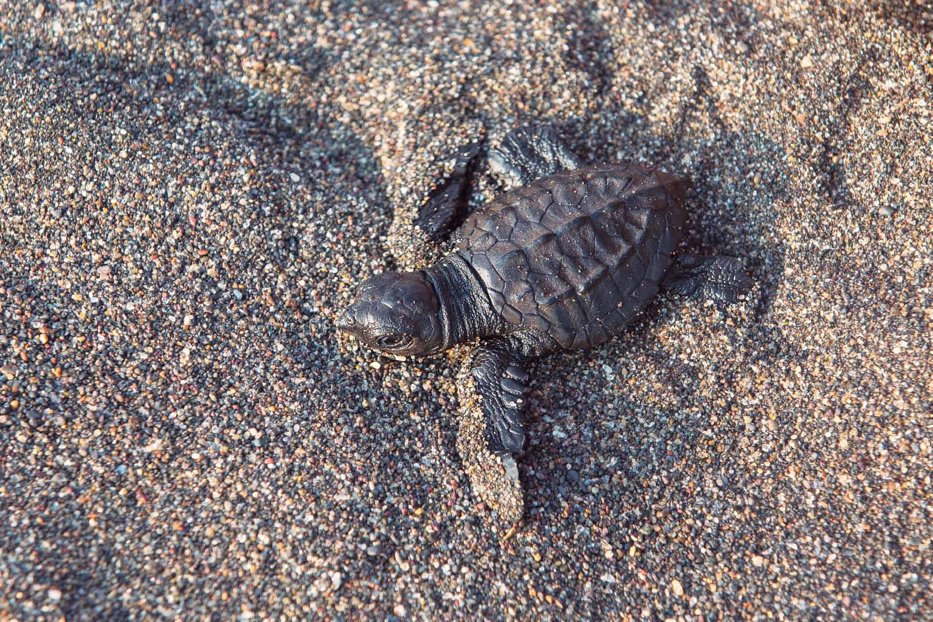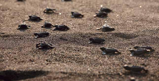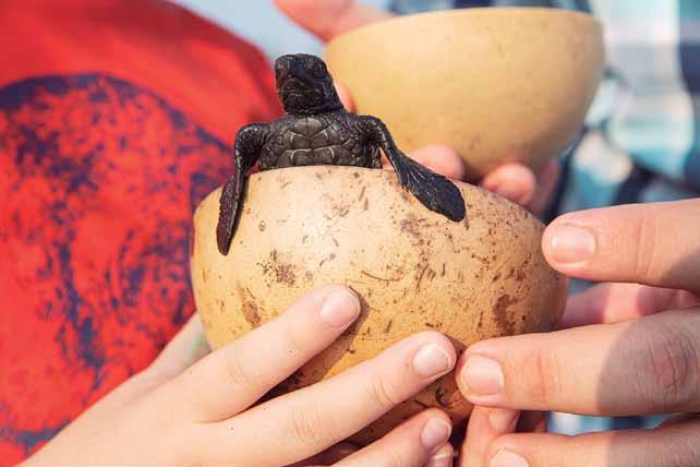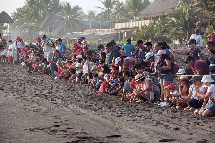 Las tortugas son recién nacidas, se mantie nen inquietas y tienen un fuerte instinto de llegar al mar. Las personas reciben a su tor tuga dentro de una jícara. En la playa hay una marca, es un límite de cuerdas y parales, sitio desde donde los participantes pueden obser var y liberarlas y con esto devolver algo a la naturaleza.