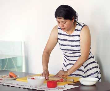 Lucrecia Salvador Núñez elabora pasteles junto a sus hijas, quienes también ayudan empacando los alimentos.