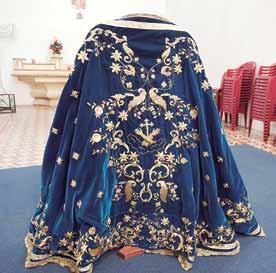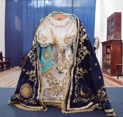 Estrada agregó que en el manto se represen tó el Cántico de las Criaturas, que San Fran cisco de Asís compuso, cuya estrofa reza: “Alabado seas, mi Señor, por el hermano Sol que nos calienta; alabado seas, mi Señor, por la hermana Luna que nos alumbra en la noche”. Es por esto que en cada esquina del manto se observa al sol y la luna, estrellas, flores, vegetación y frutos, y al centro se veía nuevamente el escudo Franciscano. También conformaron el ajuar un alba que es una vestimenta que se utiliza de bajo de la tunicela, una man tilla blanca y el fajín de la Virgen, que es lo que sirve para ceñir la cintura de la Inmaculada.