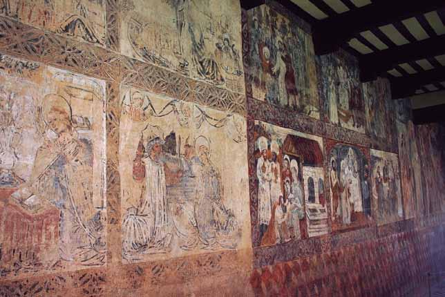 El claustro de la colegiata tiene una forma trapezoidal irregular, debido a las limitacio nes del terreno sobre el que se asienta. Del claustro medieval original solo se conserva la galería norte, ya que el resto fue recons truido en siglos posteriores. La mayoría de los capiteles del claustro narra escenas del Antiguo Testamento como el sacrificio de Isa ac, la creación de Adán o el diluvio univer sal, entre otros temas. Uno de ellos, en lugar de representar escenas bíblicas, recuerda la ceremonia de consagración de la iglesia en 1099. Los muros del claustro están decorados con pinturas que datan de los siglos XV y XVI.