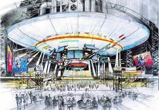 Boceto del club nocturno de Moon con nave extraterrestre en su parte superior.