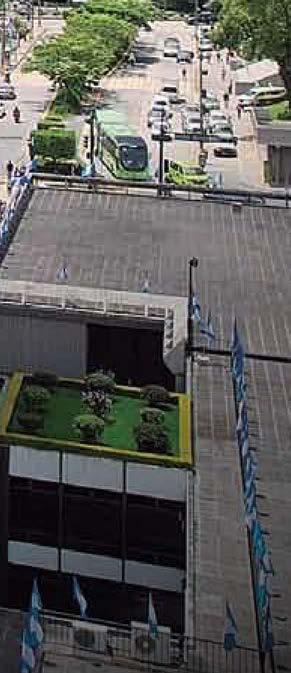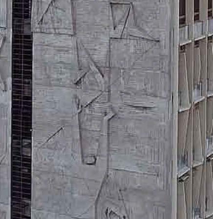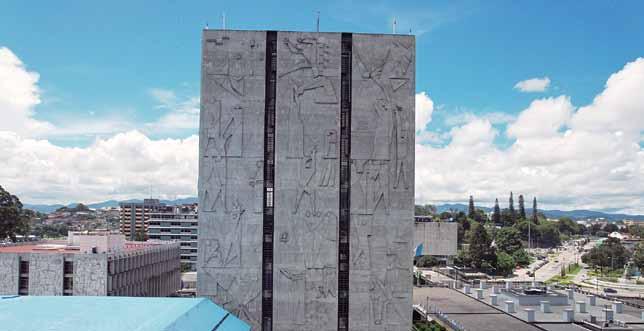 En el Banco de Guatemala se aprecia el mural Economía y Cultura, integrado por tres com ponentes verticales, a los que el académico Martínez describe así:
