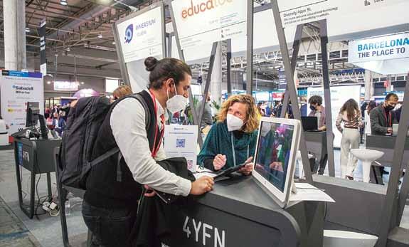 Estand de la UOC, en Mobile World Congress, donde se observa un código QR.