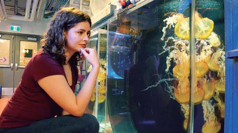 Schaub, investigadora del Departamento de Ciencias de la Tierra, el Océano y la Atmós fera y el Instituto para los Océanos y la Pes ca, de la Universidad de Columbia Británica (UBC), en Vancouver (Canadá), indaga a las medusas, animales marinos, transparentes y gelatinosos, que, en una etapa de su vida, tie nen la forma de una campana o una sombrilla con tentáculos.