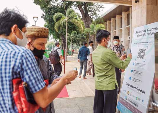 Una persona escanea un código QR de una ‹app› de rastreo de contactos Covid-19, en Indonesia.
