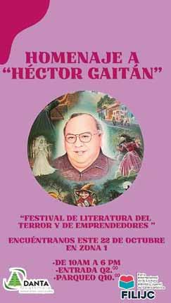 Libros, disfra ces y pelícu las habrá en el Festival de litera tura de terror, en donde se homenajeará al re cordado escritor guate malteco Héctor Gaitán Alfaro; también podrá encontrar revistas y discos con algunas de sus leyendas. La actividad se llevará a cabo el 22 de octubre, en el parqueo Beatas de Belén (9ª avenida 1342, zona 1), de 10:00 a 18:00 horas, y la admisión es Q2 por persona. Todo Lo recaudado será a beneficio de la Feria Internacional de la Lectura Infantil y Juvenil de Centroamérica (FILIJC).