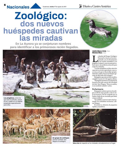 a familia del Parque Zoológico Nacional La Aurora se ha incrementado con el advenimiento de un ocelote (mamífero) y un pingüino (ovíparo), cuyo encanto parvulario ejerce una poderosa atracción para todos los visitantes. “Los dos ejemplares reciben atención especial en un área equivalente a una casa cuna, en la que se desarrollan apropiadamente”, explica Ana Lucía Vásquez, gerente de Mercadeo del zoológico. El pingüino, que aún no tiene nombre, cumplió 5 meses el 13 de agosto, último. “El pingüino pertenece al conjunto de las pocas aves que carecen de la facultad de volar”, dice Vásquez. “Pero, en cambio, es un excelente nadador”, aclara.