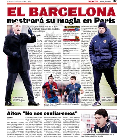 París SG Sirigu, Jallet, Alex, Thiago Silva, Maxwell, Lucas, Verratti, Matuidi, Pastore, Lavezzi e Ibrahimovic. Barcelona Valdés, Alves, Piqué, Mascherano, Alba, Xavi, Busquets, Iniesta, Tello o Alexis, Messi y Villa. Árbitro: Wolfgang Stark (ALE) Estadio: Parque de los Príncipes de París Hora: 12:45