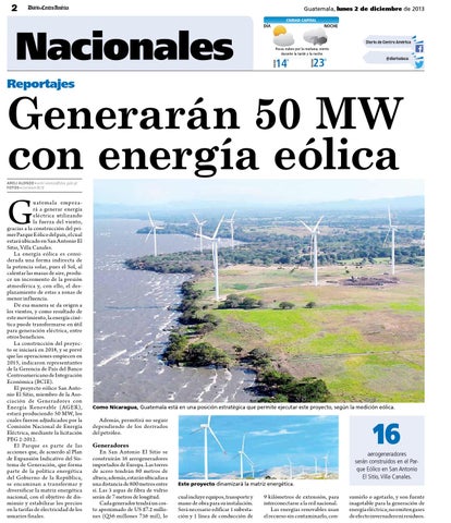 uatemala empezará a generar energía eléctrica utilizando la fuerza del viento, gracias a la construcción del primer Parque Eólico del país, el cual estará ubicado en San Antonio El Sitio, Villa Canales. La energía eólica es considerada una forma indirecta de la potencia solar, pues el Sol, al calentar las masas de aire, produce un incremento de la presión atmosférica y, con ello, el desplazamiento de estas a zonas de menor influencia. De esa manera se da origen a los vientos, y como resultado de este movimiento, la energía cinética puede transformarse en útil para generación eléctrica, entre otros beneficios. La construcción del proyecto se iniciará en 2014, y se prevé que las operaciones empiecen en 2015, indicaron representantes de la Gerencia de País del Banco Centroamericano de Integración Económica (BCIE). El proyecto eólico San Antonio El Sitio, miembro de la Asociación de Generadores con Energía Renovable (AGER), estará produciendo 50 MW, los cuales fueron adjudicados por la Comisión Nacional de Energía Eléctrica, mediante la licitación PEG 2-2012. El Parque es parte de las acciones que, de acuerdo al Plan de Expansión Indicativo del Sistema de Generación, que forma parte de la política energética del Gobierno de la República, se encaminan a transformar y diversificar la matriz energética nacional, con el objetivo de disminuir y estabilizar los precios en la tarifas de electricidad de los usuarios finales.